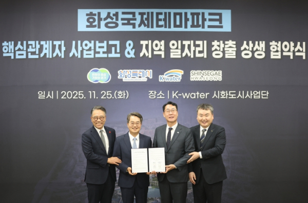 이날 김 지사는 정명근 화성시장, 임영록 신세계그룹 사장, 안정호 K-water 부문장과 ‘화성 국제테마파크 지역 일자리 창출 및 상생협력 업무협약(MOU)’을 체결했다.
